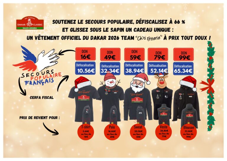 Du 3 au 17 janvier 2026, notre équipe portera haut les couleurs du Secours Populaire sur les pistes du Dakar en Arabie Saoudite. Chaque kilomètre parcouru, chaque défi relevé sera une opportunité de sensibiliser le public à l’action de cette association et de collecter des fonds pour ses missions.